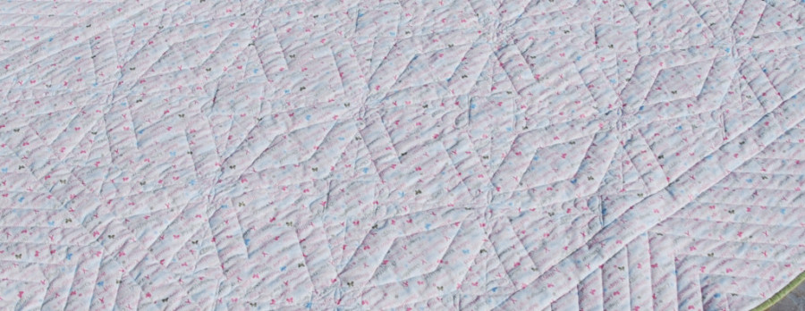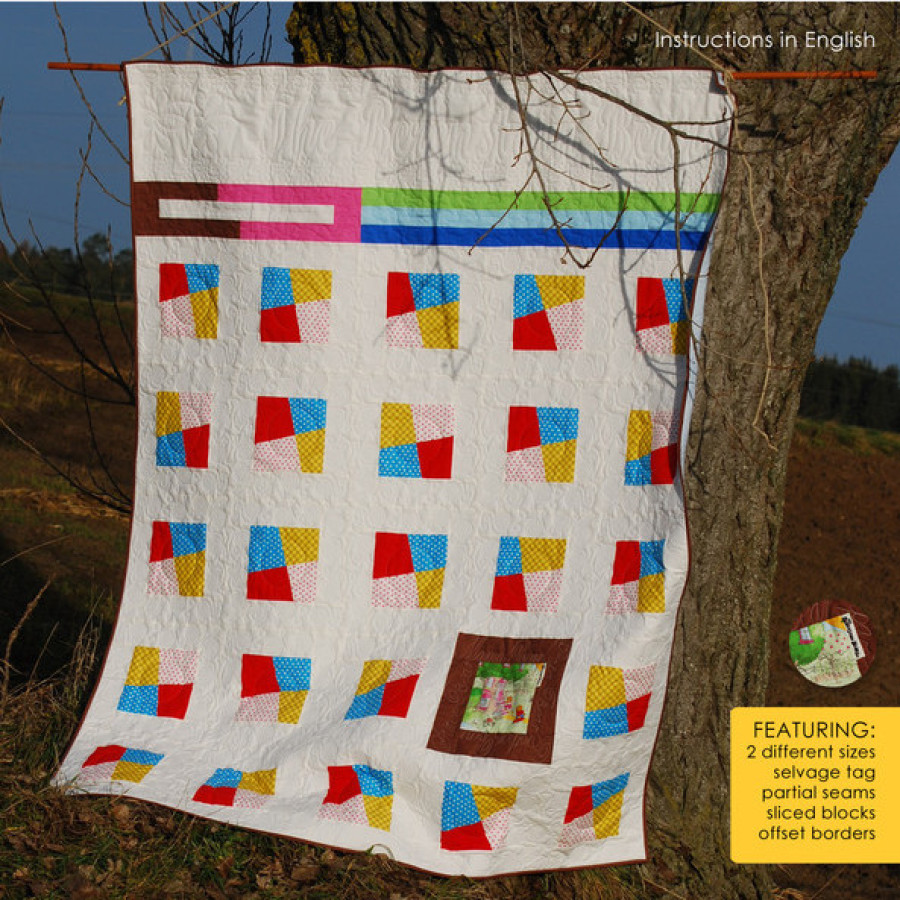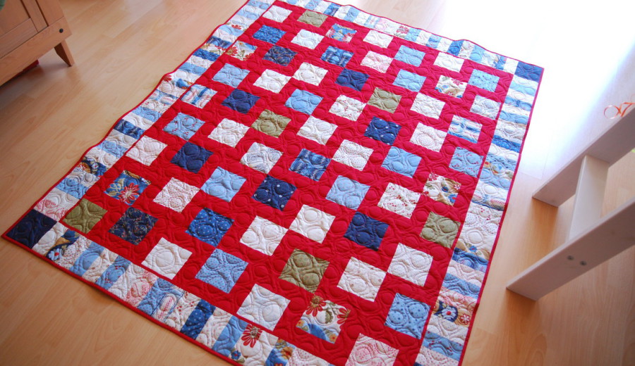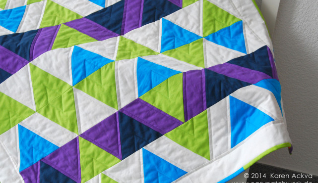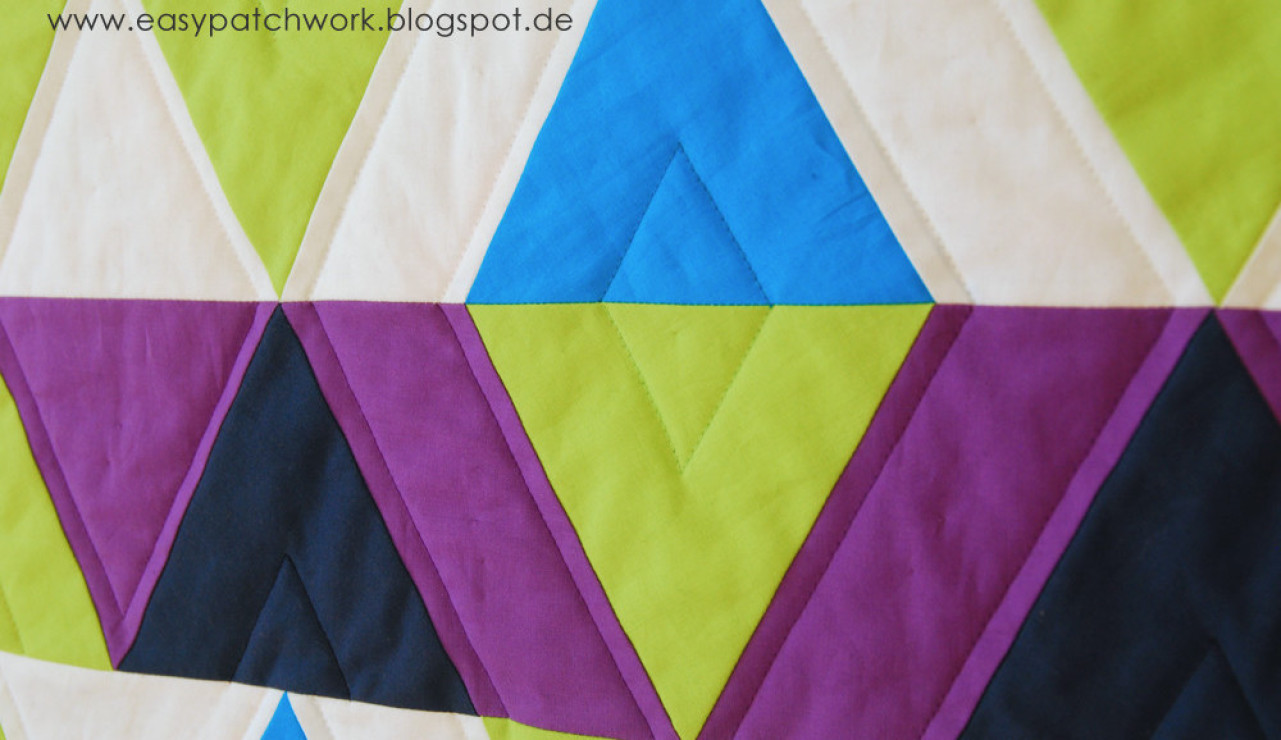 I really wanted to make this patchwork come to life and designed it with a colored, alternating strip binding. I was almost in a pickle getting the fabric, because I ran out of the chartreuse green. It was on back order, so I ordered it at a second online shop. I applied the strip binding rotating the quilt always to the left for a really special effect. (It is not a continuous binding.)
