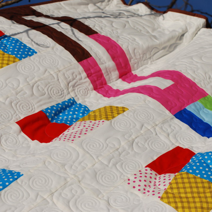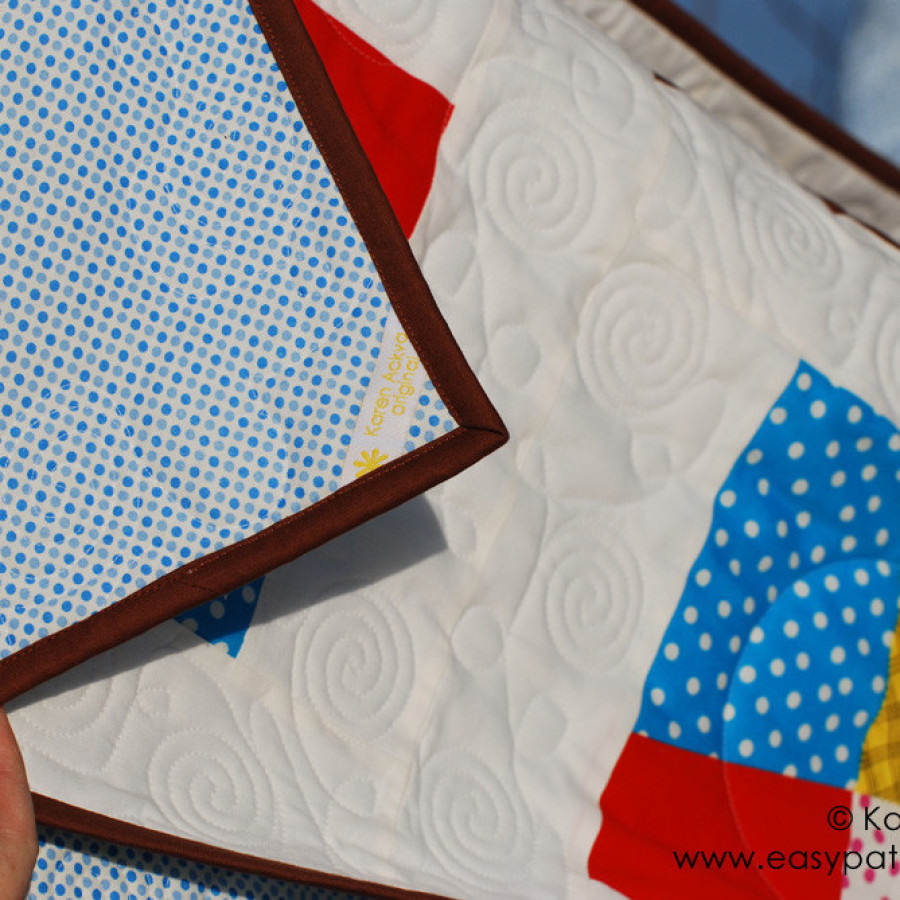 It was my first try at using a piping as an inner border. I thought some of the squares would have been lost if it weren't there. It has a really nice, warm and snuggly flannel backing. I made a label from t-shirt transfer.