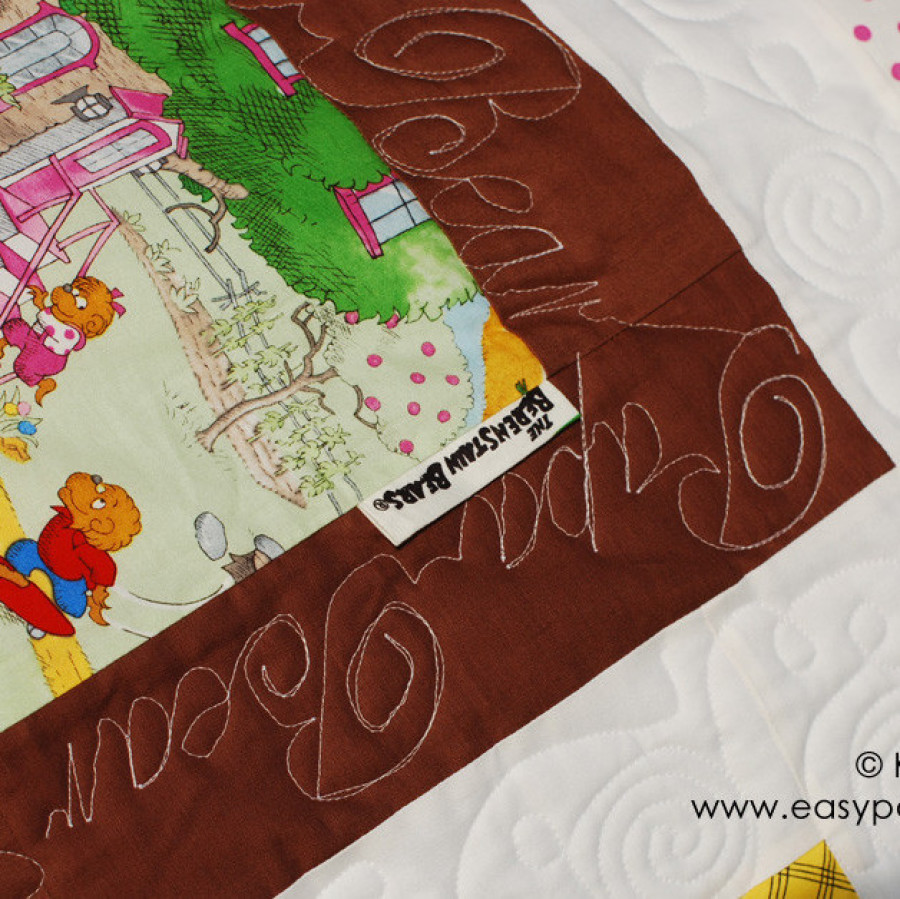 What makes this quilt different is the offset border and the fabric panel. I didn't want to use all of the fabrics in the series, because I wanted just the "family" to be the main point. I inserted a label from the fabric selveage stating the name of the fabric - Berenstain Bears. I had my dear friend and quilter, Brigitte Heitland quilt it for me. Good things take time and she did a fantastic job at it. She incorporated the name of the bears at the top of the quilt just like I wanted!! It turned out so fantastic.
