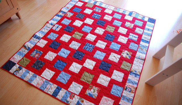 I made this quilt last year from a pattern I found in a German magazine. This layout has become a very typical layout in recent years, because it utilizes a layer cake or charms in the easiest way.