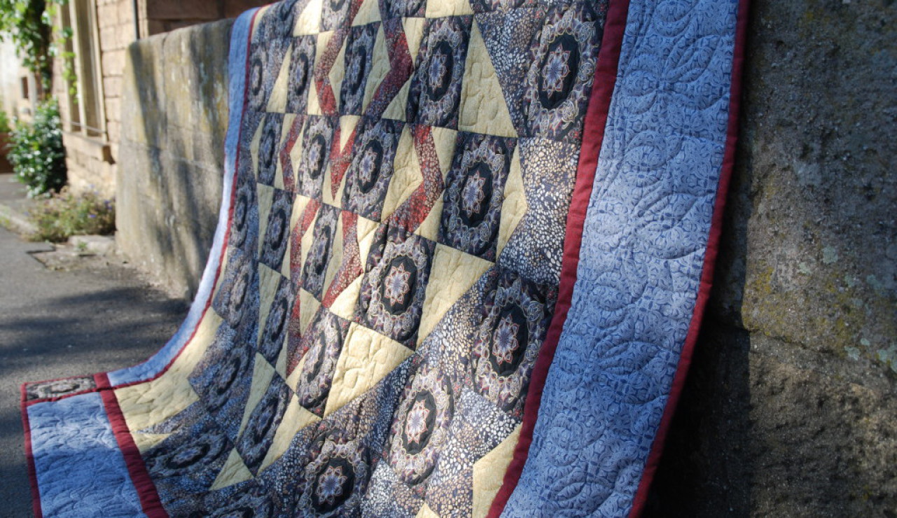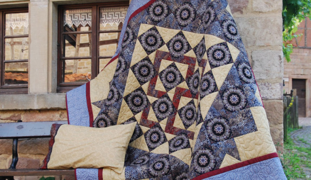 I designed the pattern after seeing my inspiration quilt in the Fall 2009 edition of Fons & Porter's Love of Quilting - Easy Quilts. On page 61, you will see a quilt by Ann Lauer 60.5 x 60.5 inches. It is called Walk About. The colors and fabric were very fitting to the recipients, because they are very connected with the Middle East and have travelled there often and for longer periods of time.