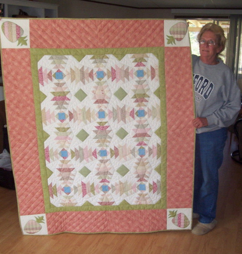 I happily gave my mom her quilt when I visited her again, back in North Carolina in fall of 2010. I think she enjoyed it, but was a little disappointed with the machine quilting. You know, it is always hard to please a hand quilter! ;-) I was very proud of this quilt, because it was and remains one of the most difficult things I have made. I attempted the Y-Seam only one other time in the five sisters block which I also gave to my mom.