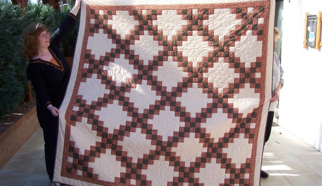 My in-laws are very kind and respectful people. I wanted to repay them by giving them a gift completely from my heart. I used a pattern of a typical Irish chain quilt in very tradtional colors. This measures 2 x 2 meters and is ALL HANDQUILTED. This was the biggest project that I have ever handquilted. I now only hand quilt small baby blankets usually just for my immediate family.