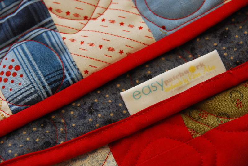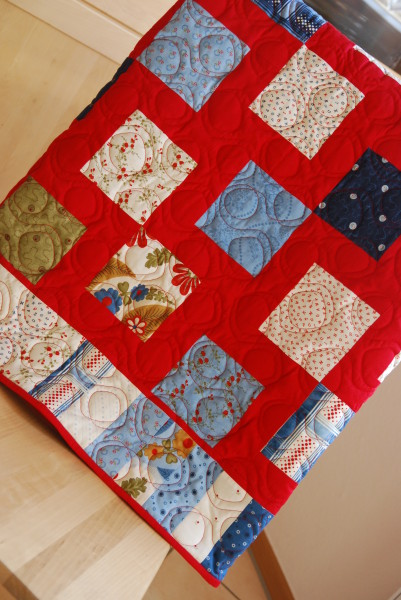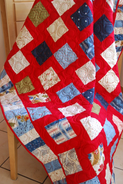 I sent off my two quilt tops from last year to Brigitte Heitland of QD Service Long Arm Quilting in Werther, Germany. (She quilted a couple of blankets for me in 2010 which I was very pleased with. She is such a nice woman, full of inspiration and warm heartedness.) We quickly agreed on the "bubble bop pantograph" for my American Primer patchwork lap blanket. I received the blanket back on Saturday and couldn't wait to put the binding on it. I finished it up yesterday and here it is.