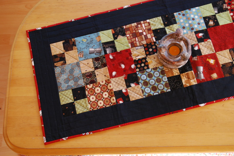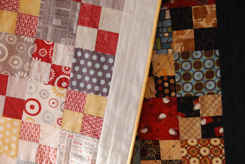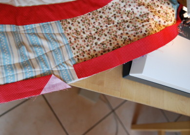 I try to make the binding for my quilts before they are even finished. There is a formula for this: length x width x 2 = strip length. I miscalculated but just a little bit! Thank goodness I still had some binding fabric around. I wanted to use it for another project, but just thought something like this could happen.