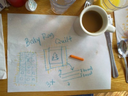 You never know when inspiration may hit you. When we were on vacation, I took advantage of the kiddie crayons and blank placemat (normally given at most restaurants to entertain the kids) to design one of my quilts - actually an idea that was screaming to get out of my head. This one is for a rag quilt made from baby clothes.