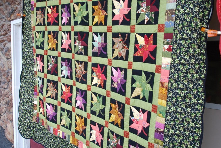 Well, today is the first day of October, and my Carolina Fall Foliage is finished. Do you remember how it started in 2011? I Took three charm packs of fall prints and took the best 100 added Carolina blue and mustard yellow! I sewed them together in rows of 10 until I had a nice square. I added a small border of rust. Then I used a flic flac template and cut out all 100 flic flacs turned them 45° and sewed them back together. Voila!