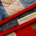 Most of the patches have one color of fabric from the four family members. (There is also a third bear called Honey Bear, but we have no third child, and I never introduced my kids to Honey Bear.) To break up the unity of the entire blanket, I added just a touch of this print.